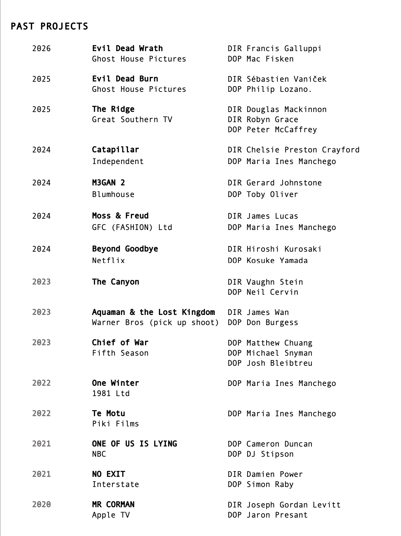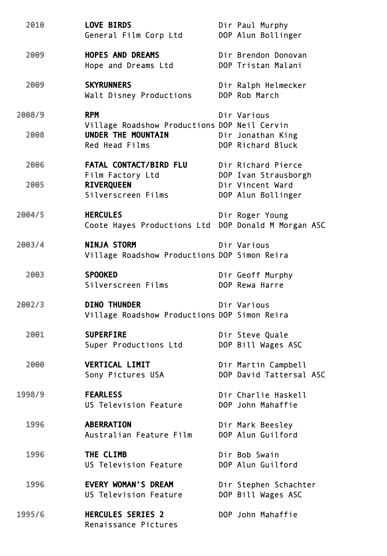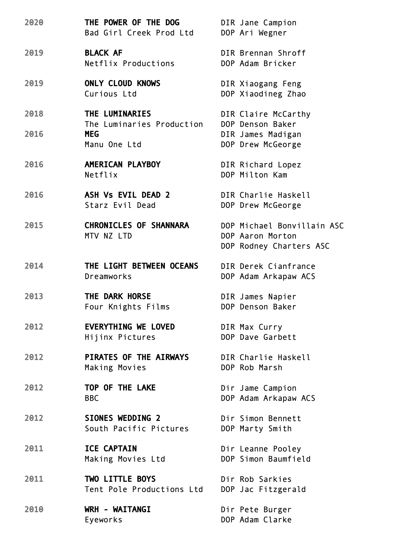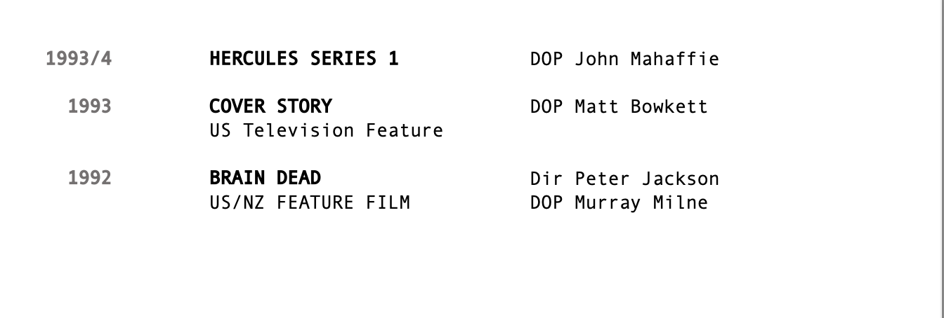 Trained in both Australia and New Zealand in the 80’s. Experience in Europe, Asia and extensively through the South Pacific. In the Early 90’s his debut Gaffer role was on Peter Jackson’s “Brain Dead”. Forty years on he has worked as a main unit Gaffer on New Zealand and International Films, Television and TVC's